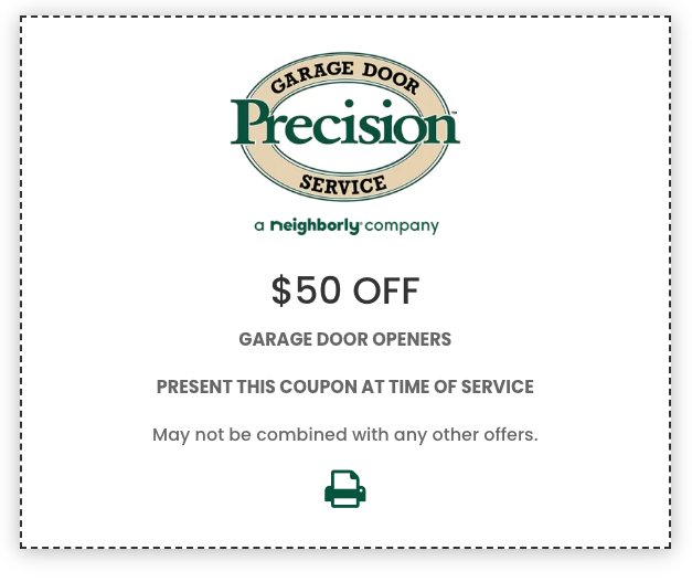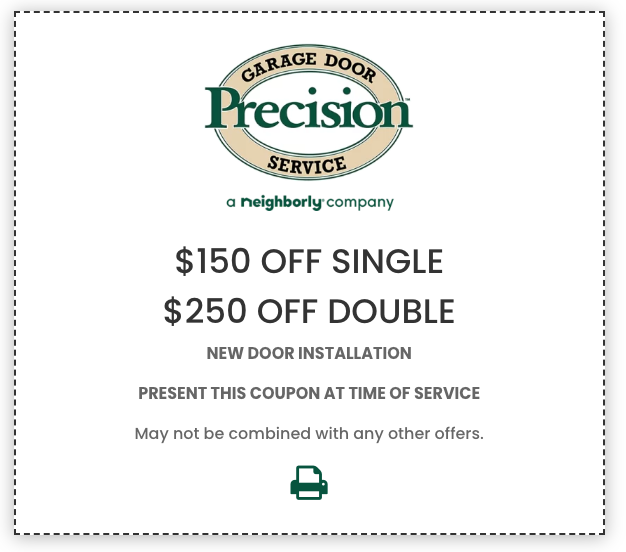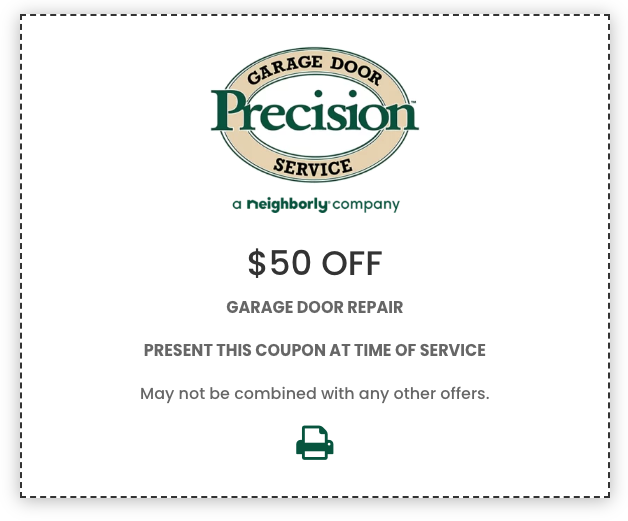 Looking for garage door repair coupons that’ll help you save on your next project? You’re in luck! At Precision, we do the job right the first time. We also offer specials on repairs, garage door openers, and new door installations. To take advantage of your discount, simply print one of these coupons or present it to your technician on your mobile device.