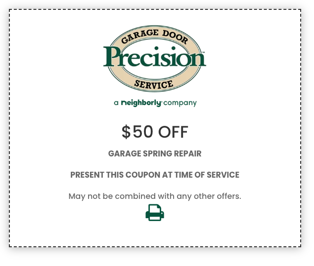 May not be combined with any other offers. Valid on the repair or replacement of any garage door springs, including torsion and extension springs, regardless of size, type, or quantity. May be applied to single or double spring systems. Covers both parts and labor when service is performed by a Precision Garage Door technician.
